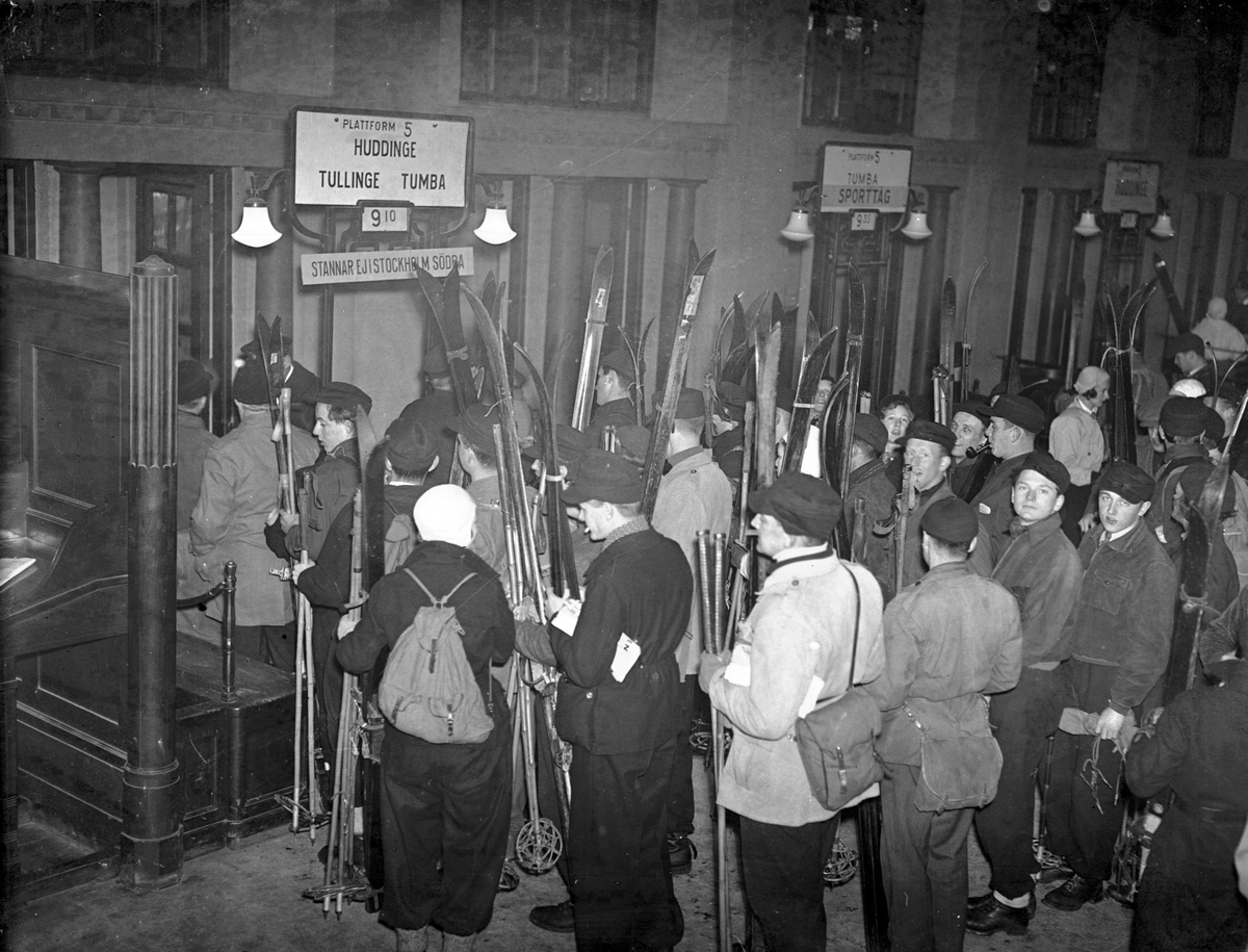 Resande i kö som väntar på sporttåget mot Huddinge, Tullinge och Tumba vid plattform 5.