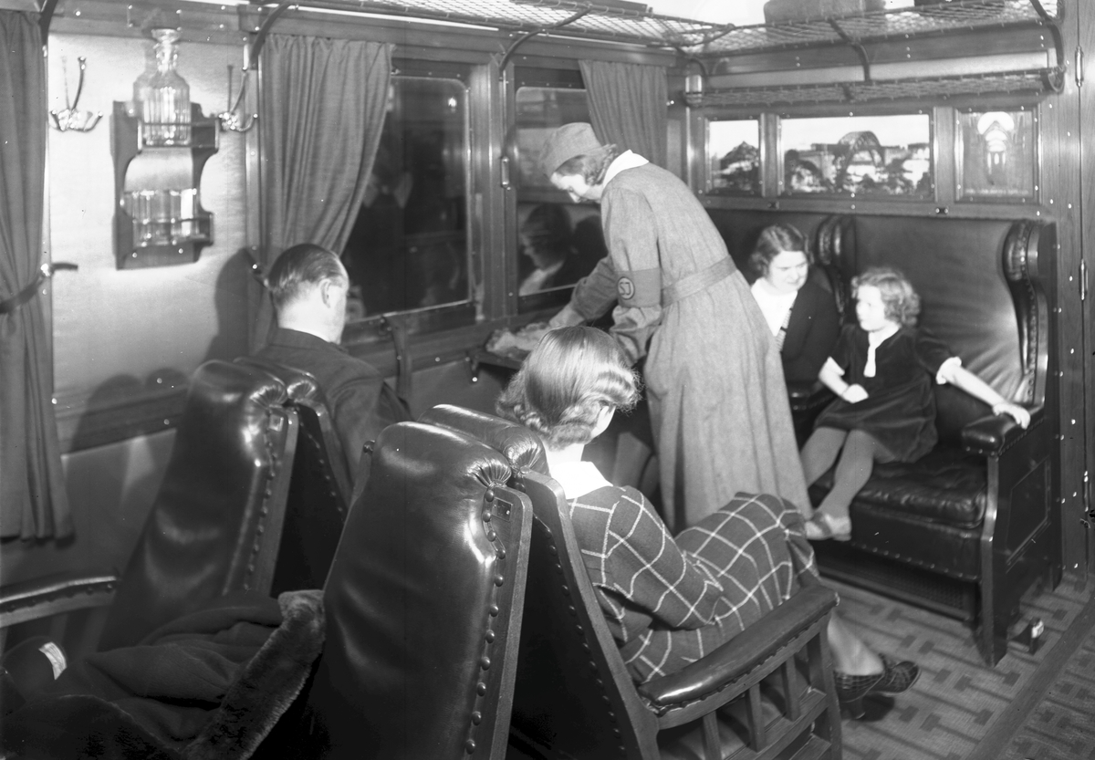 Statens Järnvägar, SJ Co5. Salongsvagn 2:a klass. En av personalen dammtorkar.