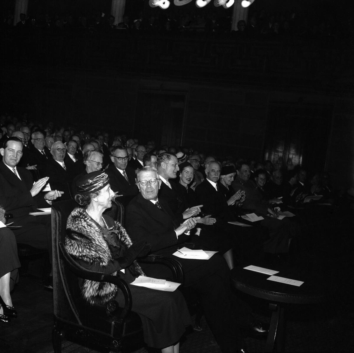Jubileums avslutning i Konserthuset. Kung Gustaf VI Adolf och Drottning Louise, gäster och Statens Järnvägar SJ personal sitter i publiken.