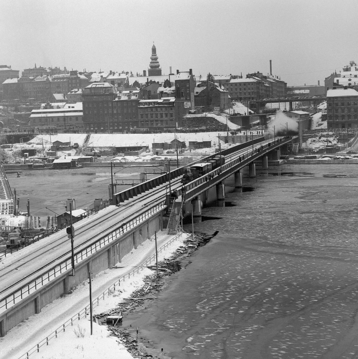 Statens Järnvägar SJ 1856-1956. 100-årsjubileum.Tåg med gamla lok och vagnar på Södra Järnvägsbron på sträckan mellan Riddarholmen och Mälarstrand..
