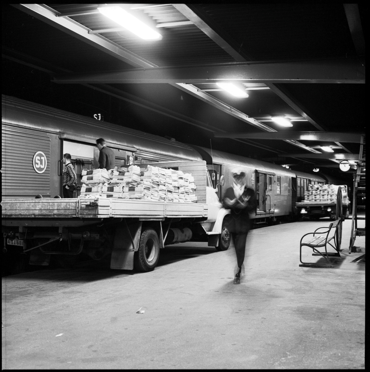 Tidningslastning Pressbyrån, mellan lasbil och för sortering / buntning ombyggda person - resgodsvagnar.