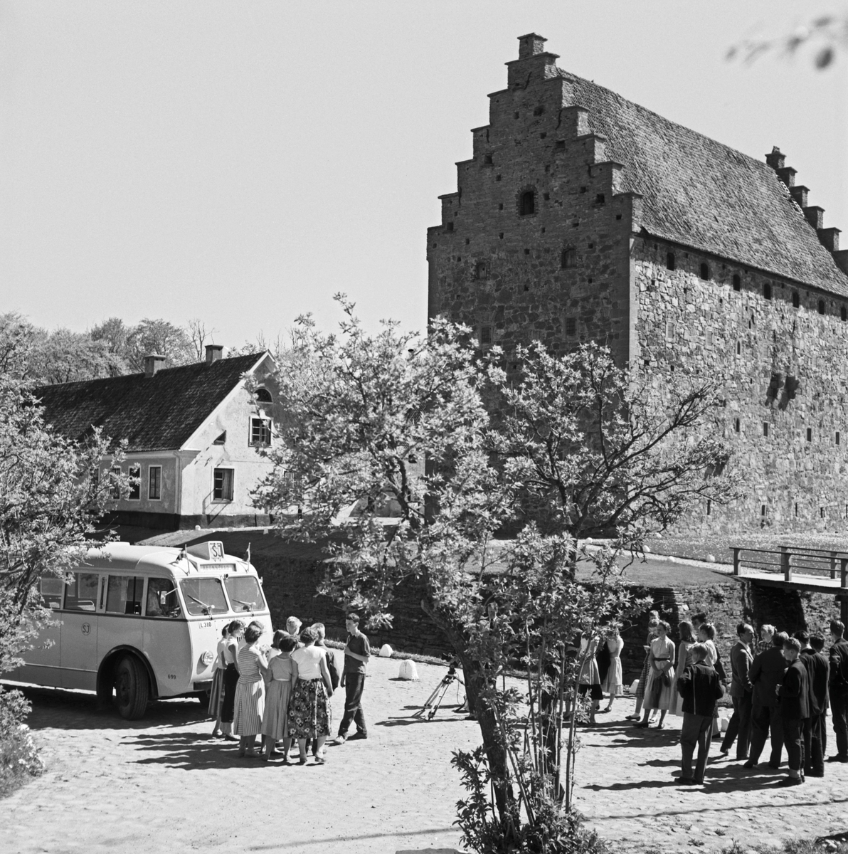 Läroverkselever på studiebesök vid Glimmingehus. Foto taget i samband med resa med Blackebergs Läroverks tåghem.