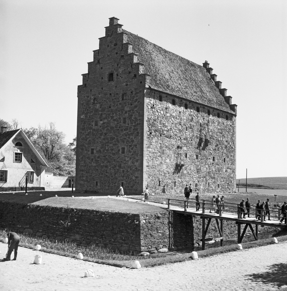 Läroverkselever på studiebesök vid Glimmingehus. Foto taget i samband med resa med Blackebergs Läroverks tåghem.