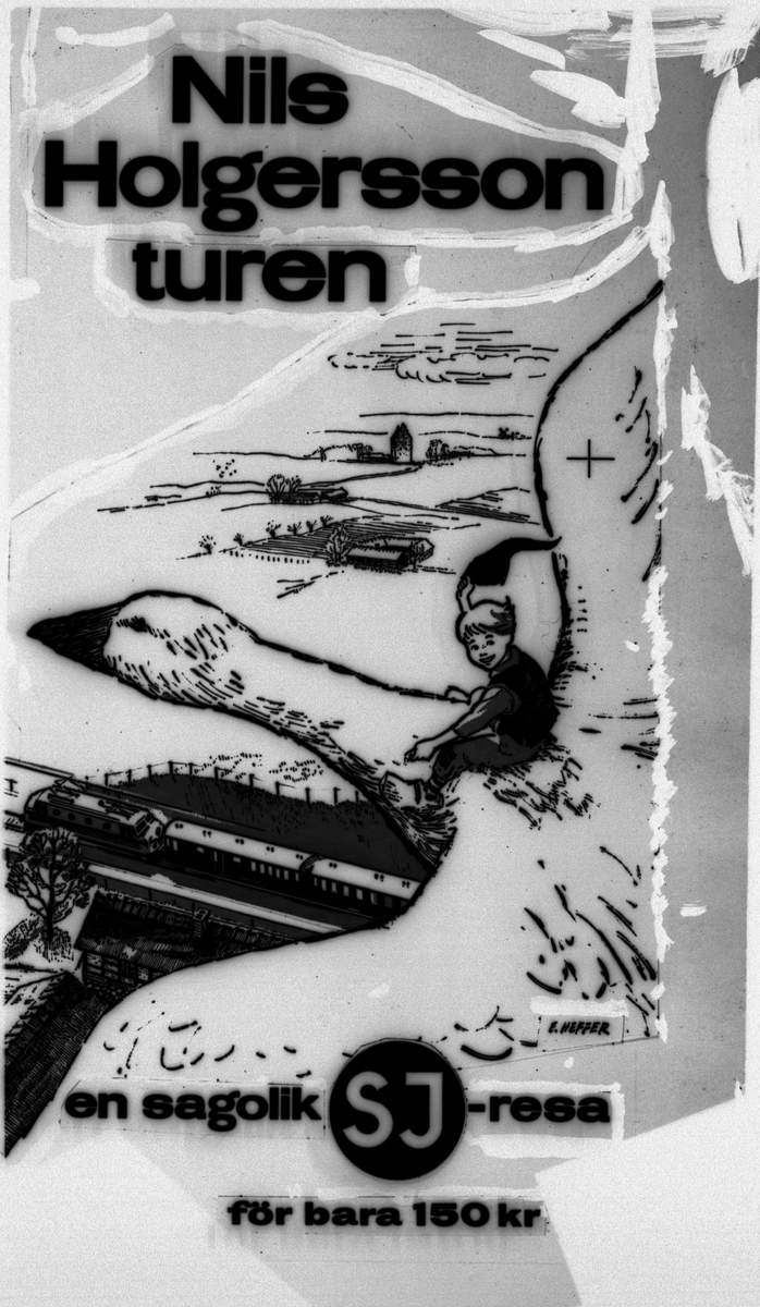 Titel: Nils Holgersson turen. Nils Holgersson-teckningar för annons. En sagolik SJ-resa för bara 150 kr.