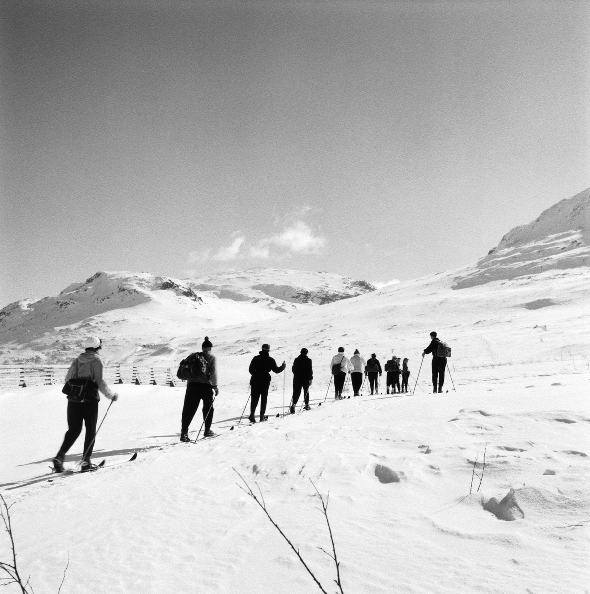 Titel: Skidåkare, tåghems-resenärer vid Låktatjåkko och Riksgränsen.