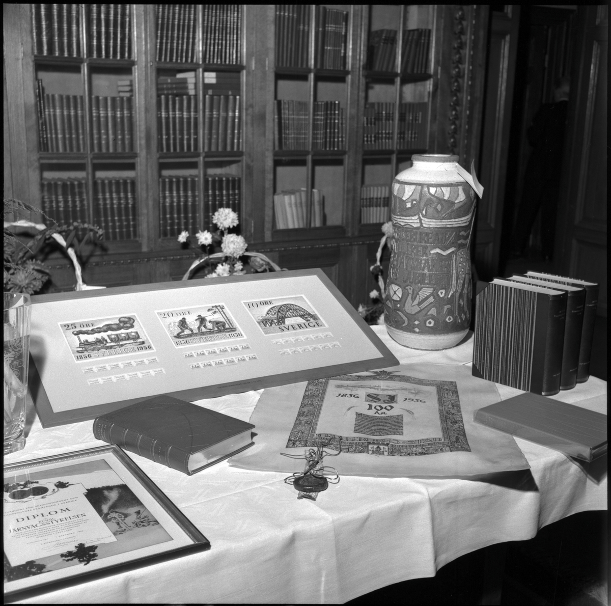 Utställning av jubileumsgåvor i hallen framför plenisalen.