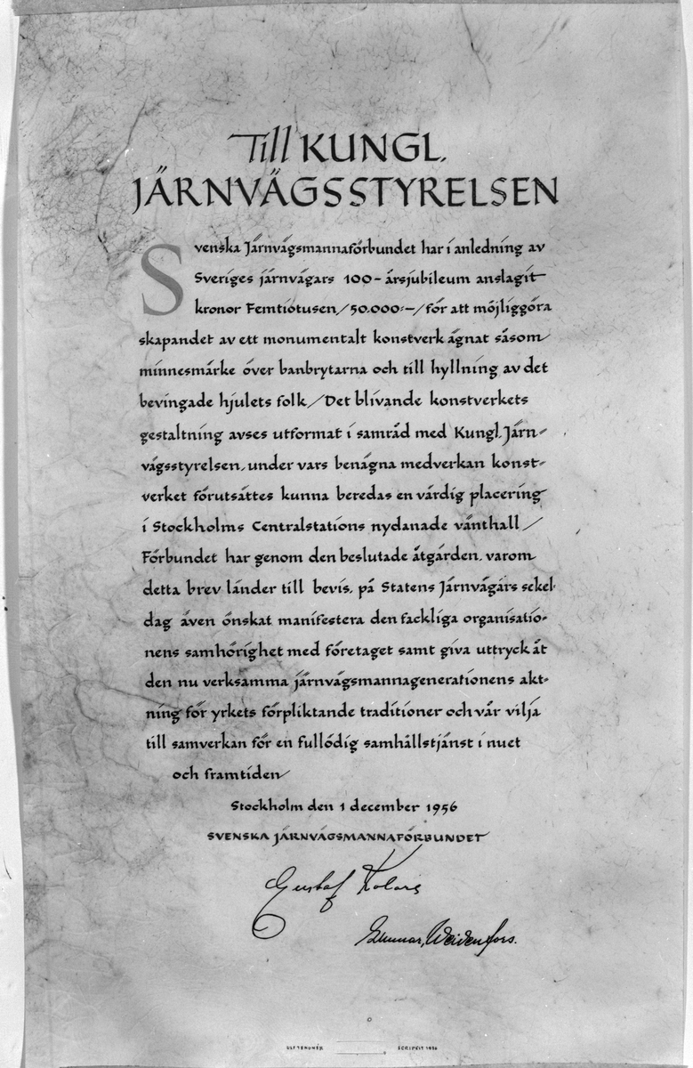 Brev skrivet till Kungliga Järnvägsstyrelsen av Svenska Järnvägsmannaförbundet med anledning av SJs 100 års jubileum. 50 000 kr anslogs till konstverk.