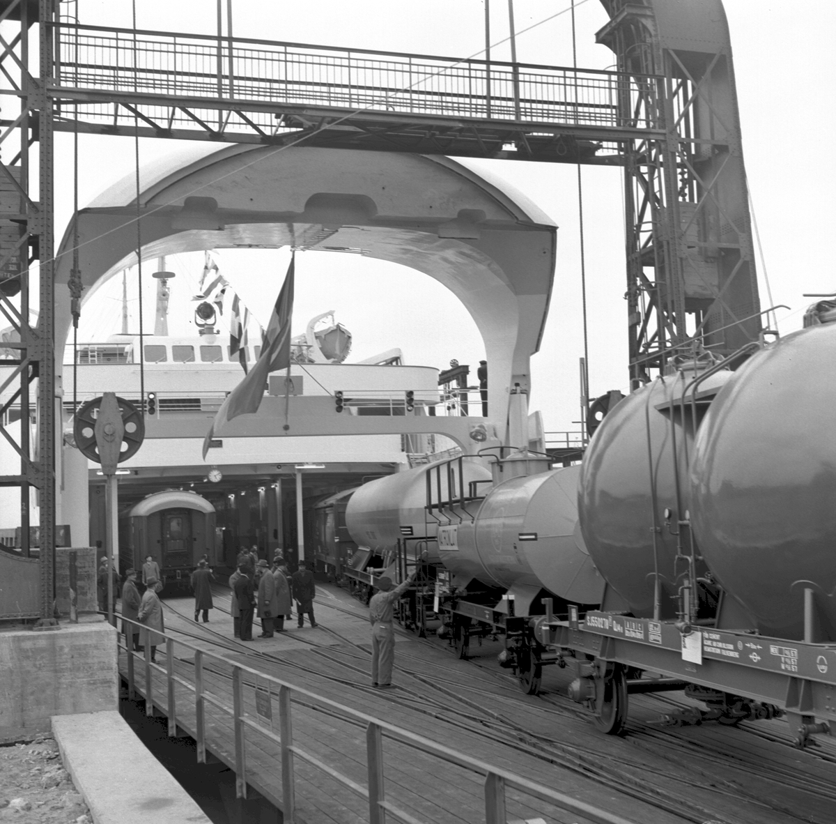 Titel: M/S"Trelleborg" passagerar och godsvagnar växlas ombord på färjan i Trelleborg.