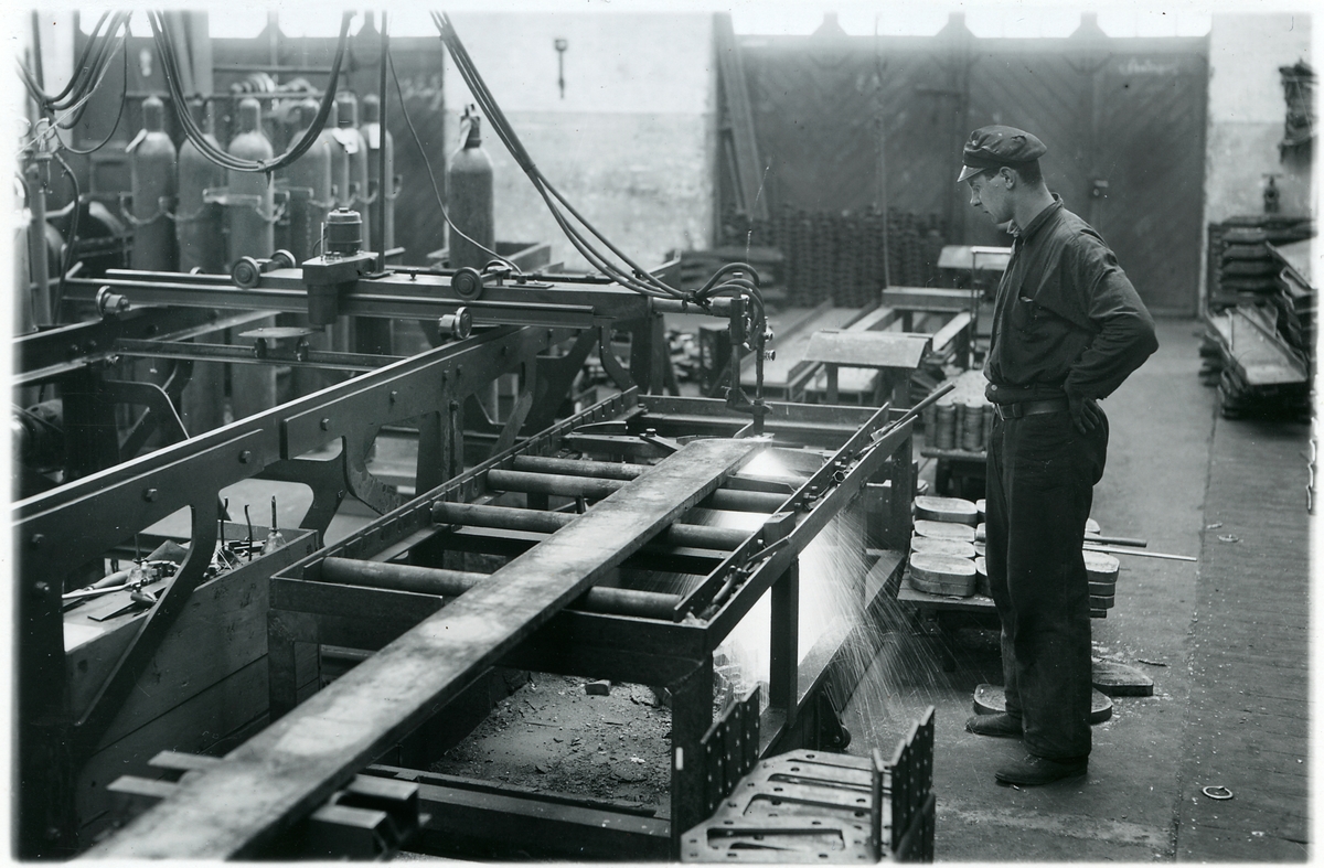 AB Gävle vagnverkstad AGV. Skärning av detalj på balk i nitfixtur.
