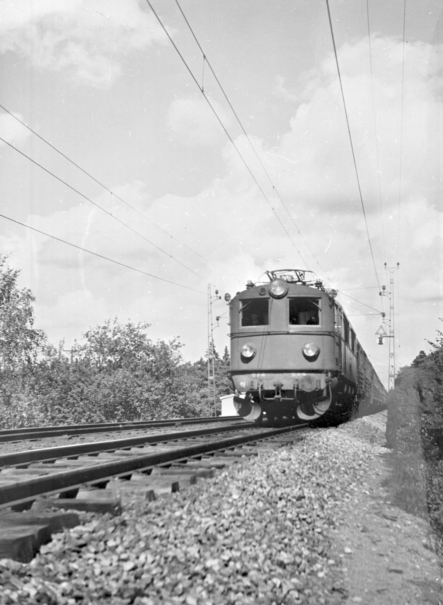 Statens Järnvägar, SJ F 694. Snälltåg. Byggår 1949. Loken som fick littera F sattes in i de snabba fjärrtågen, då kallade snälltåg, mellan Malmö-Stockholm, Malmö-Göteborg och Stockholm-Göteborg. F-loken användes också i tågen Stockholm-Oslo.