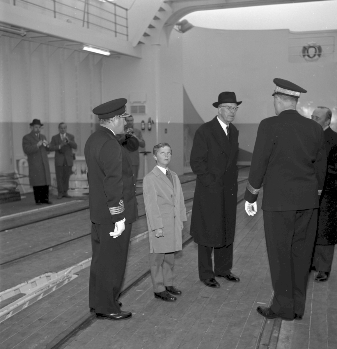 Kungabesöket på tågfärjan "Trelleborg" i Stockholm, Gustav VI Adolf och kronprins Carl Gustaf sedemera Carl XVI Gustaf.