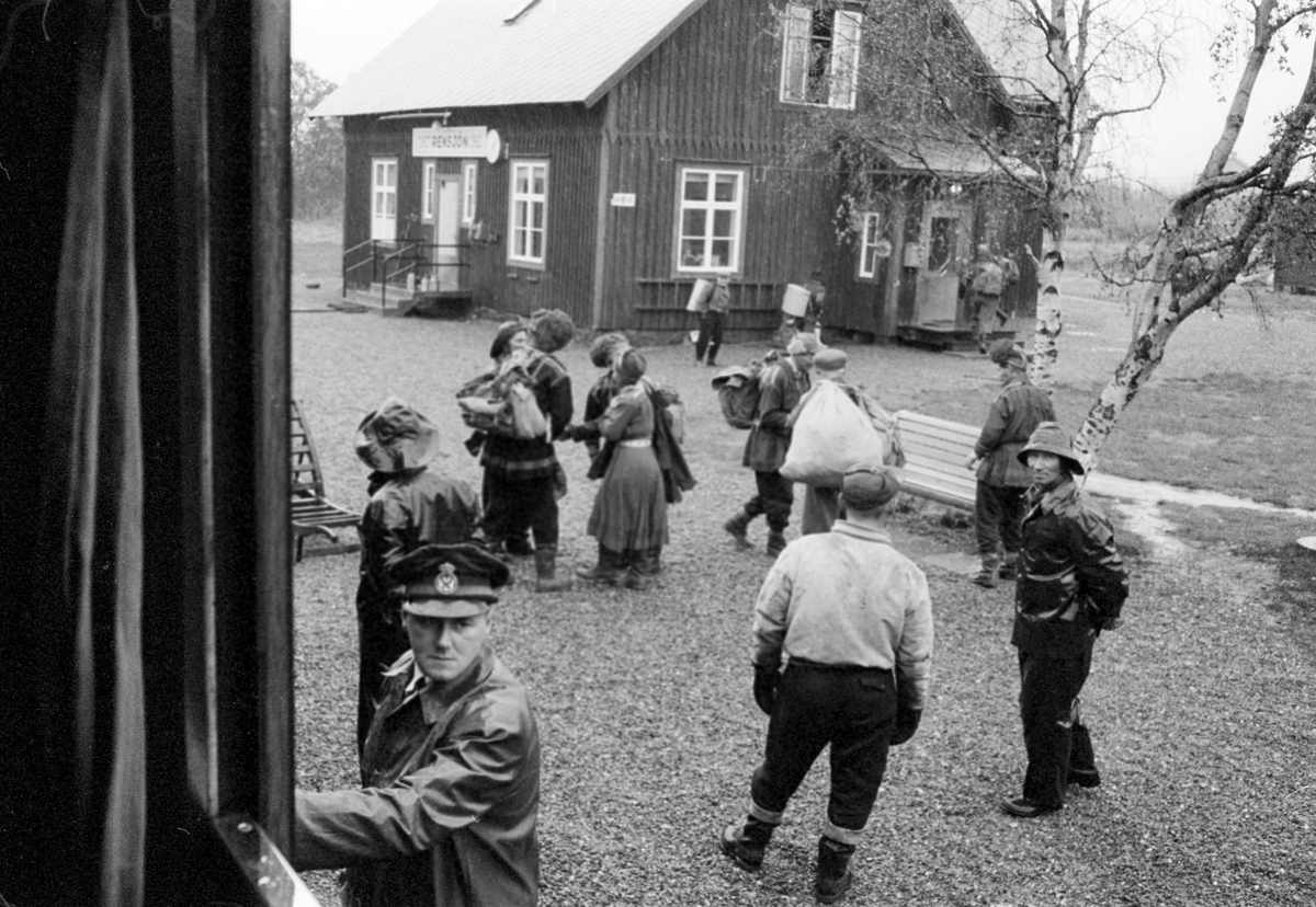 Tåg vid Rensjön station med resenärer. Närmast i bild konduktör Uno Bolin, till höger i bild (mannen i sydväst) banbiträde Nicko Sunna.