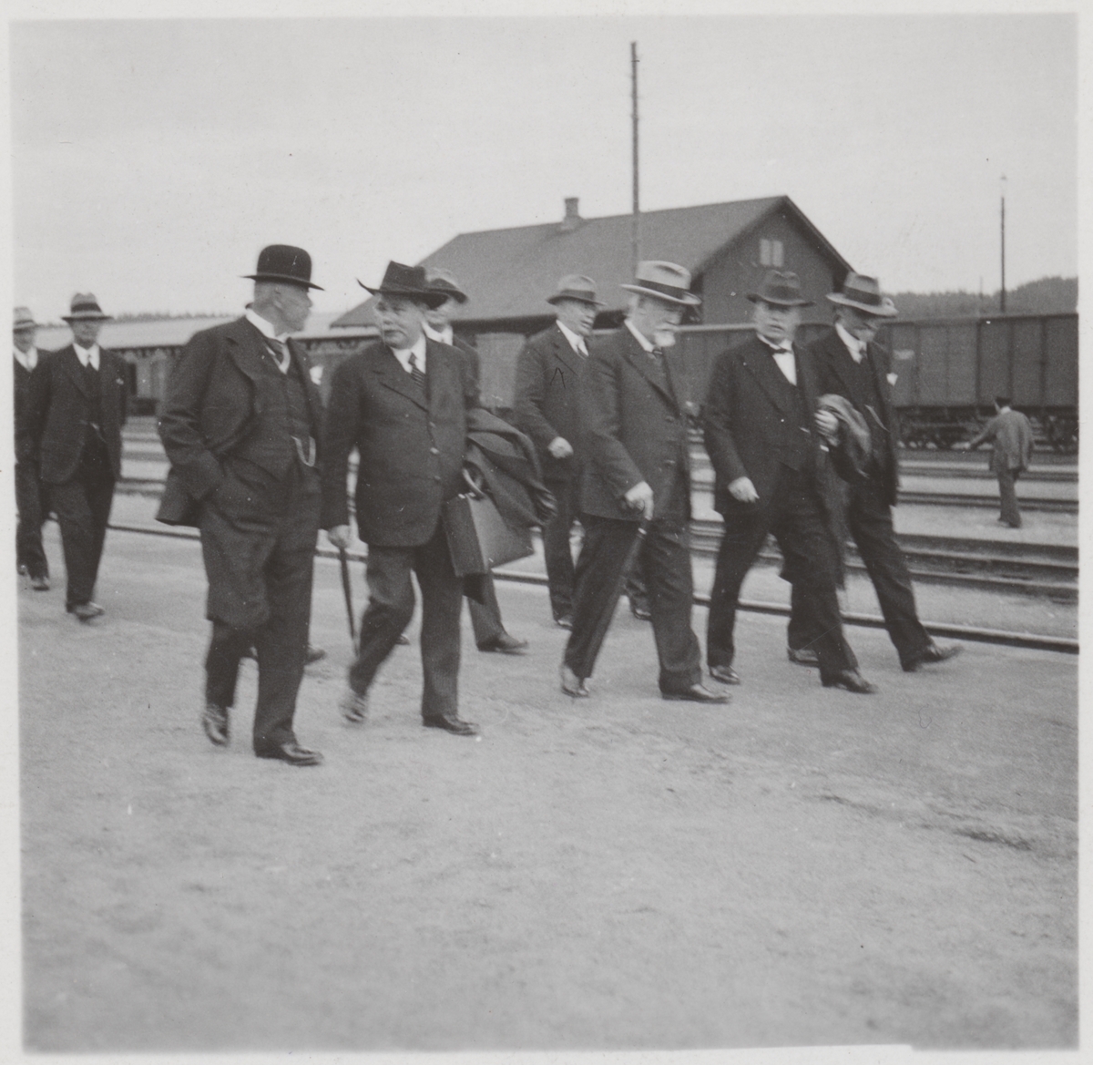 Landshövding Bernhard Eriksson samt förre landshövdningen Herman Kvarnzelius närvarar vid invigningen av Statsbanan Malung-Vansbro på Vansbro Station. Kvarnzelius syns i mitten av bilden och till vänster om honom går Eriksson.