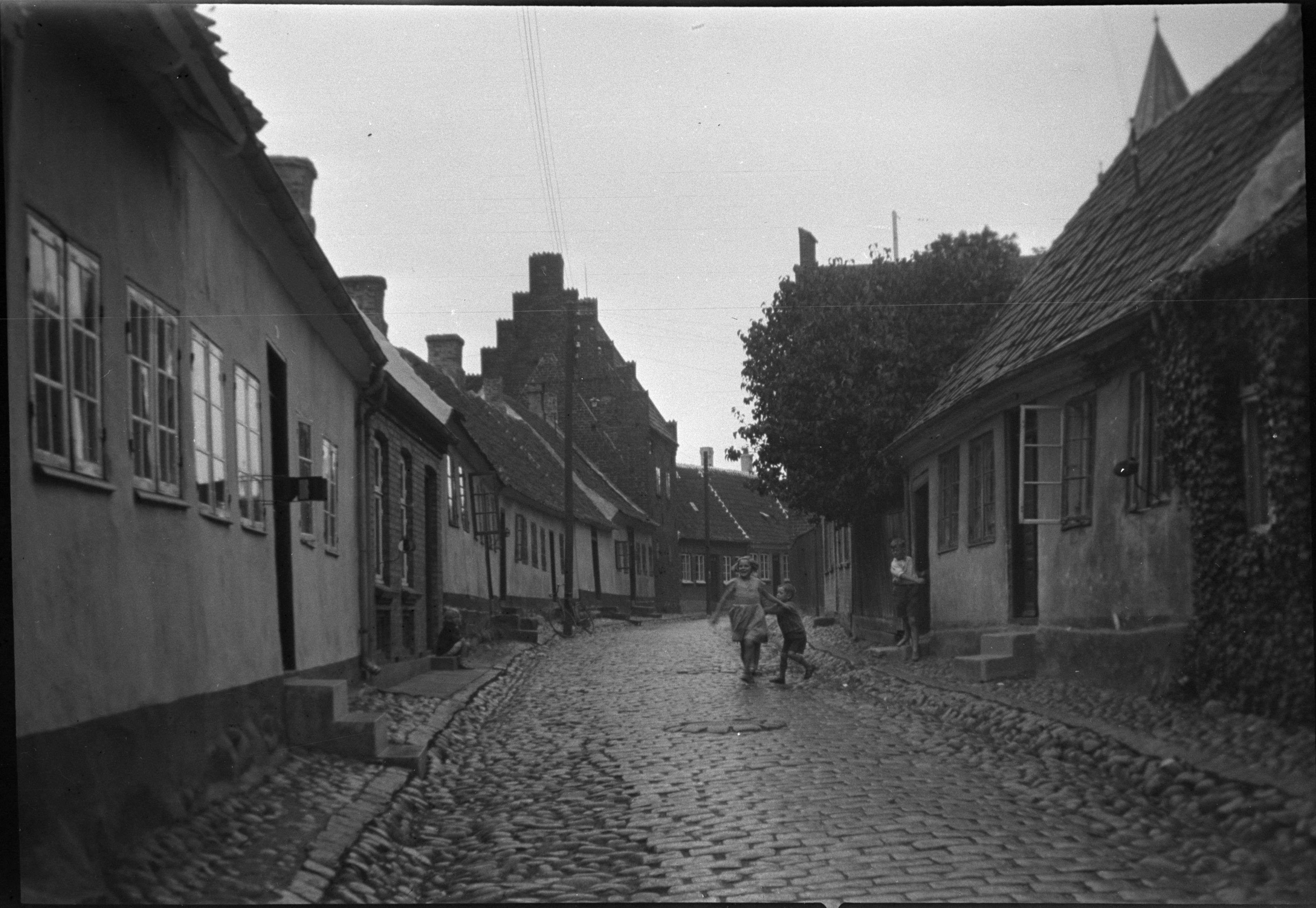 Barn på Præstegade. I bakgrunden till vänster syns det medeltida "Stenhuset" med trappgavlar.