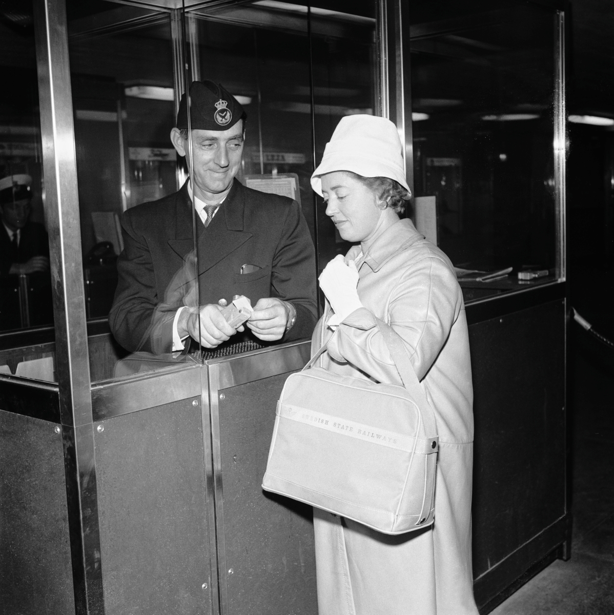 Dam med SJ-väska i biljettspärr