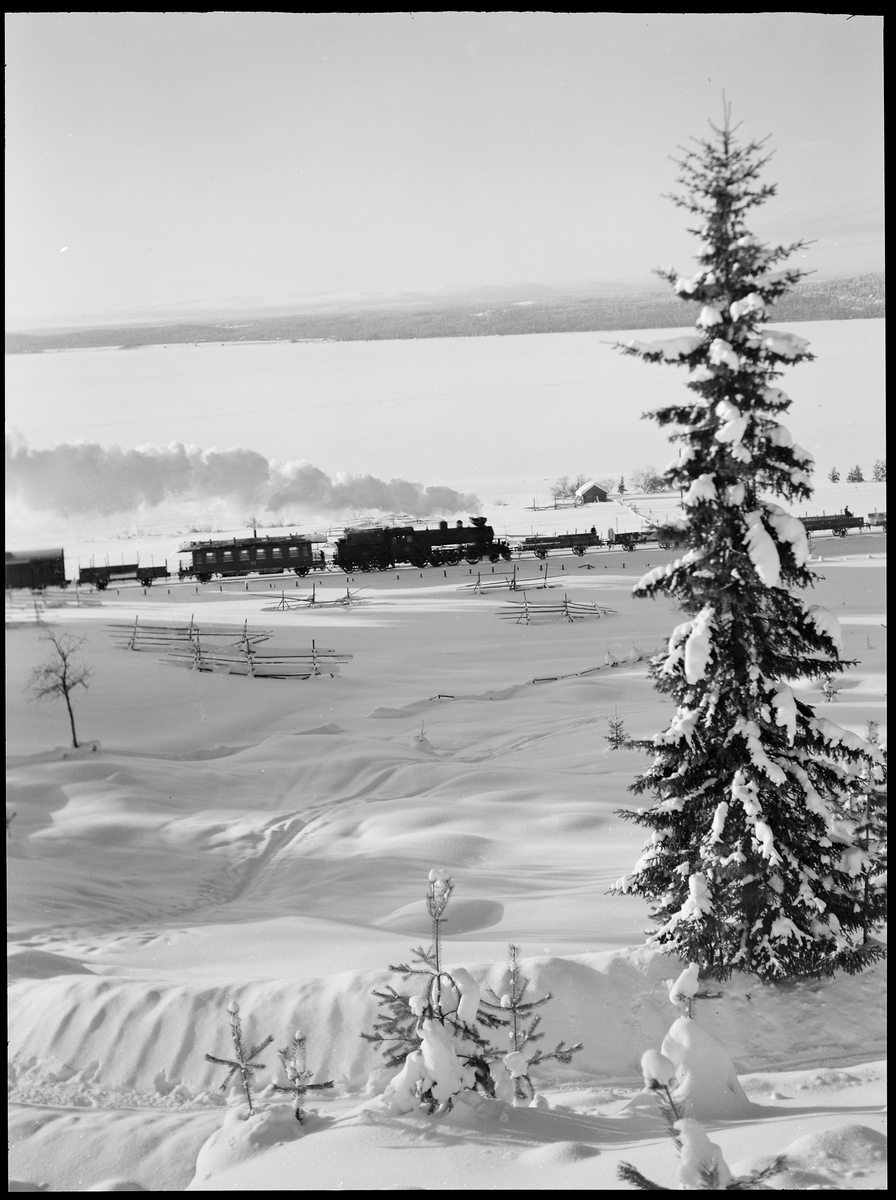 Statens Järnvägar, SJ E2 ånglok med SJ C3g-vagn skjuter godsvagnar framför sig efter lossning av vagnarna på linjen.