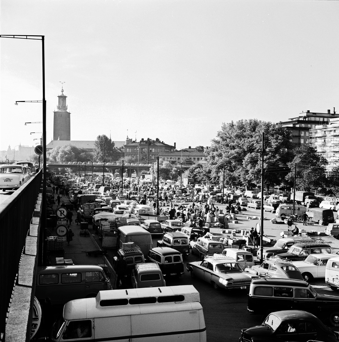 Klarahallen, salutorg. Försäljning av frukt, grönt och blommor. Stadshuset i bakgrunden.