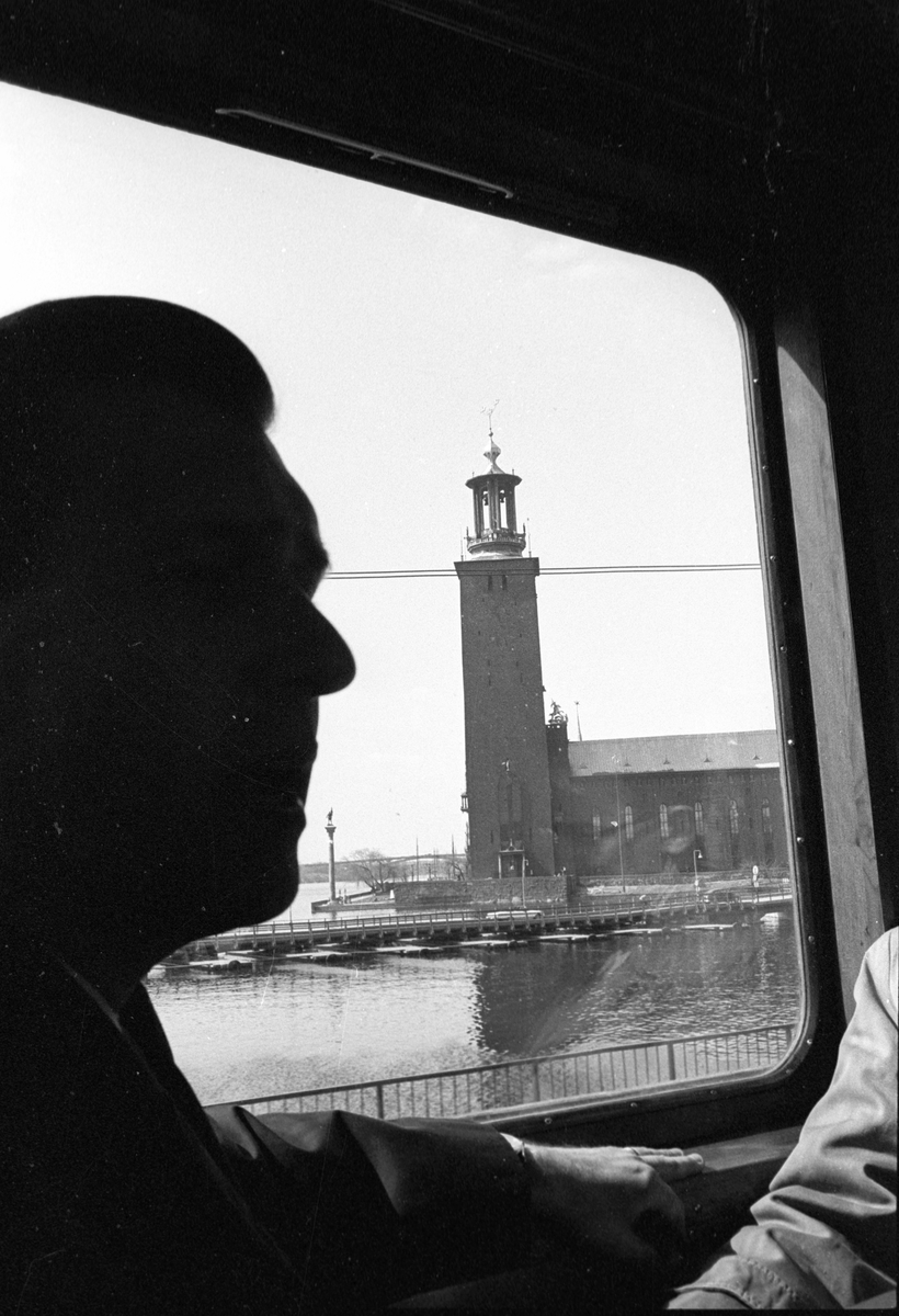 Profil av passagerare, med utsikt mot Stadshuset på sträckan mellan Riddarholmen och Stockholm Central. Fotot taget under färd över Norra Järnvägsbron.