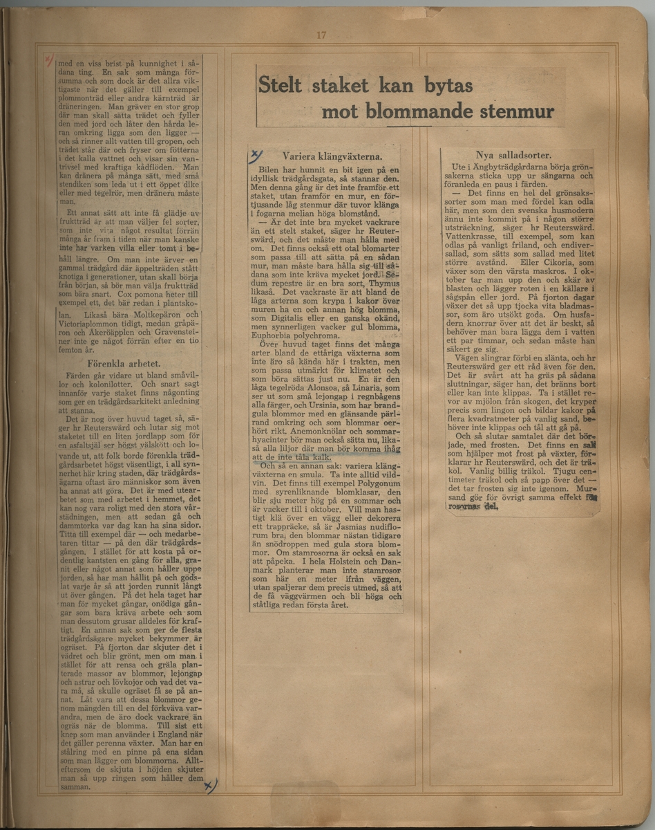 Tidningsklipp ur "Uppsatser om trädgårdar m.m. som på ett eller annat sätt beröra Gösta Reuterswärd 1931-1943".