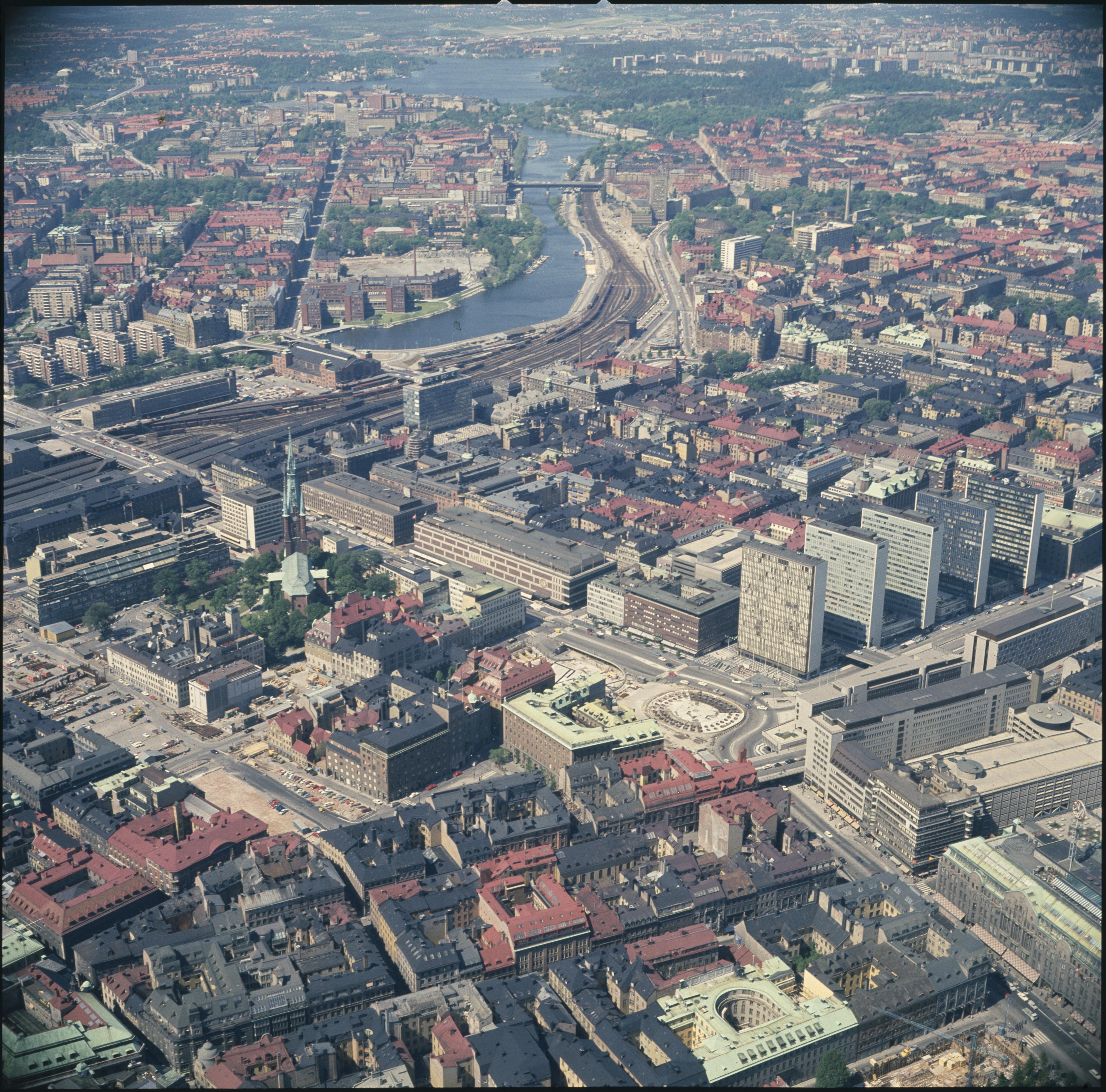 City mot väster med hamngatan i förgrunden. Rivningar.
