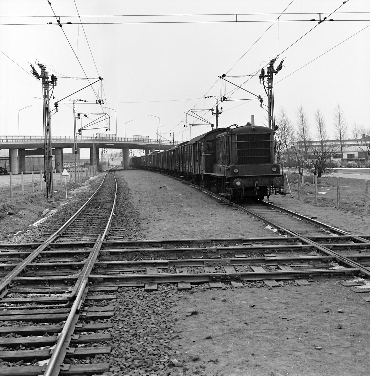 Spårvägen korsar järnvägen. Statens Järnvägar diesllok SJ V3 med godståg.