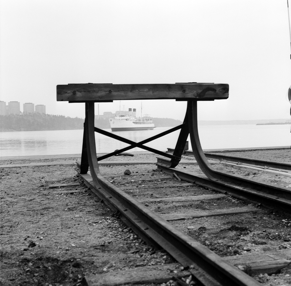 Stoppbock. Värta-hamnen. Tågfärjan Statens Järnvägar SJ "Starke" i bakgrunden. Tågfärjan trafikerade linjen Värtan - Nådendal.