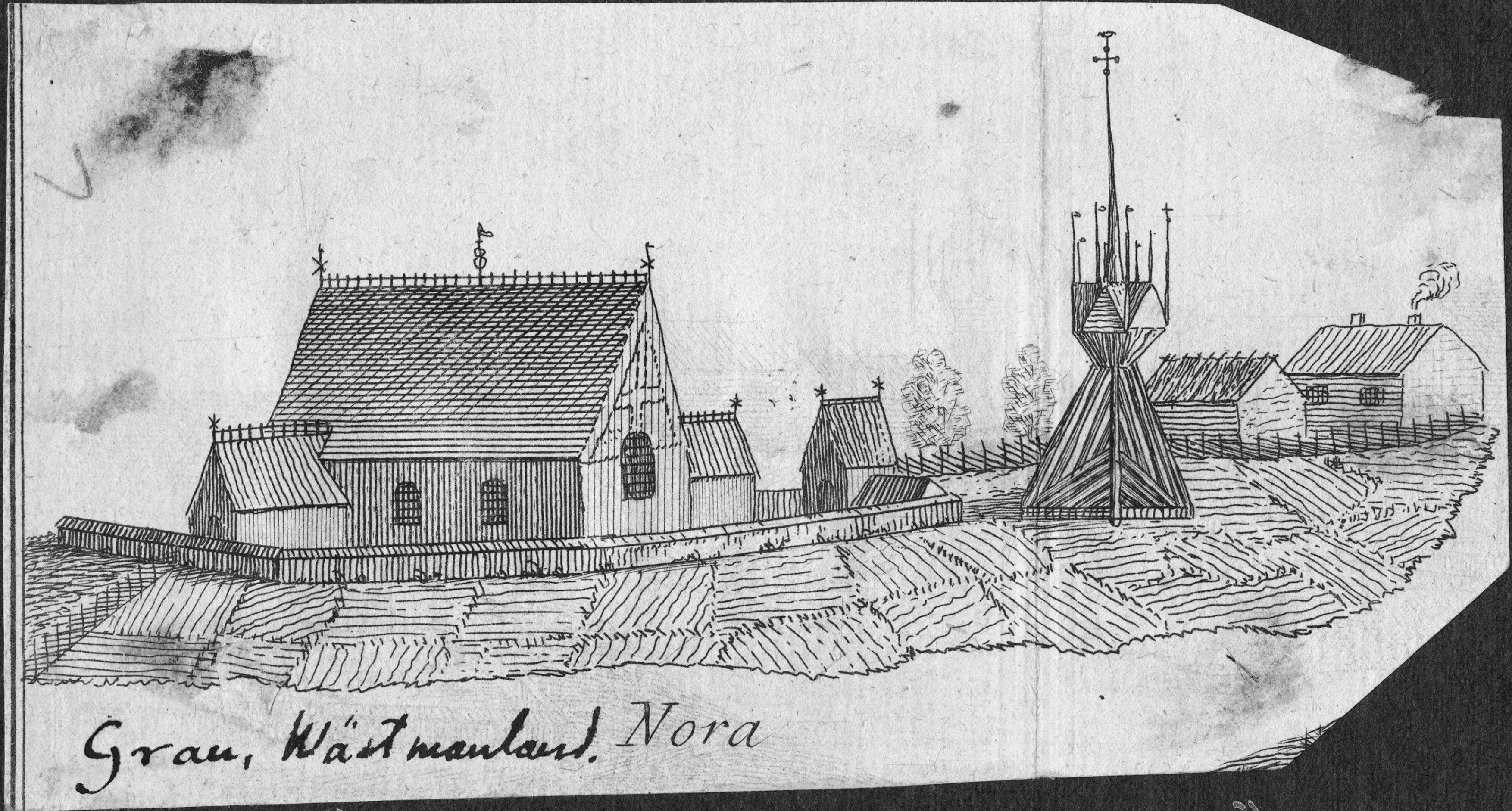 Ritning: kyrkan på 1700-talet. Efter Grau, Beskrivning över Västmanland, 1748.