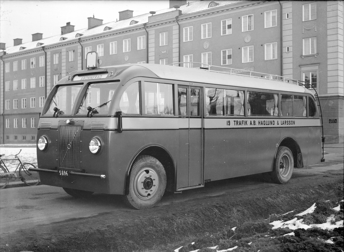 Volvo-buss för Haglund & Larsson i Sunne. Tilllverkad vid AB Svenska Järnvägsverkstäderna. AB Svenska Järnvägsverkstäderna använde främst chassier från Volvo, Skania-Vabis och Shevrolet för att bygga bussar. Tillverkningen av busskarosser skylde sig från kontrakt till att karossen med inredning, målning och andra detaljer blev gjurda. S 694.