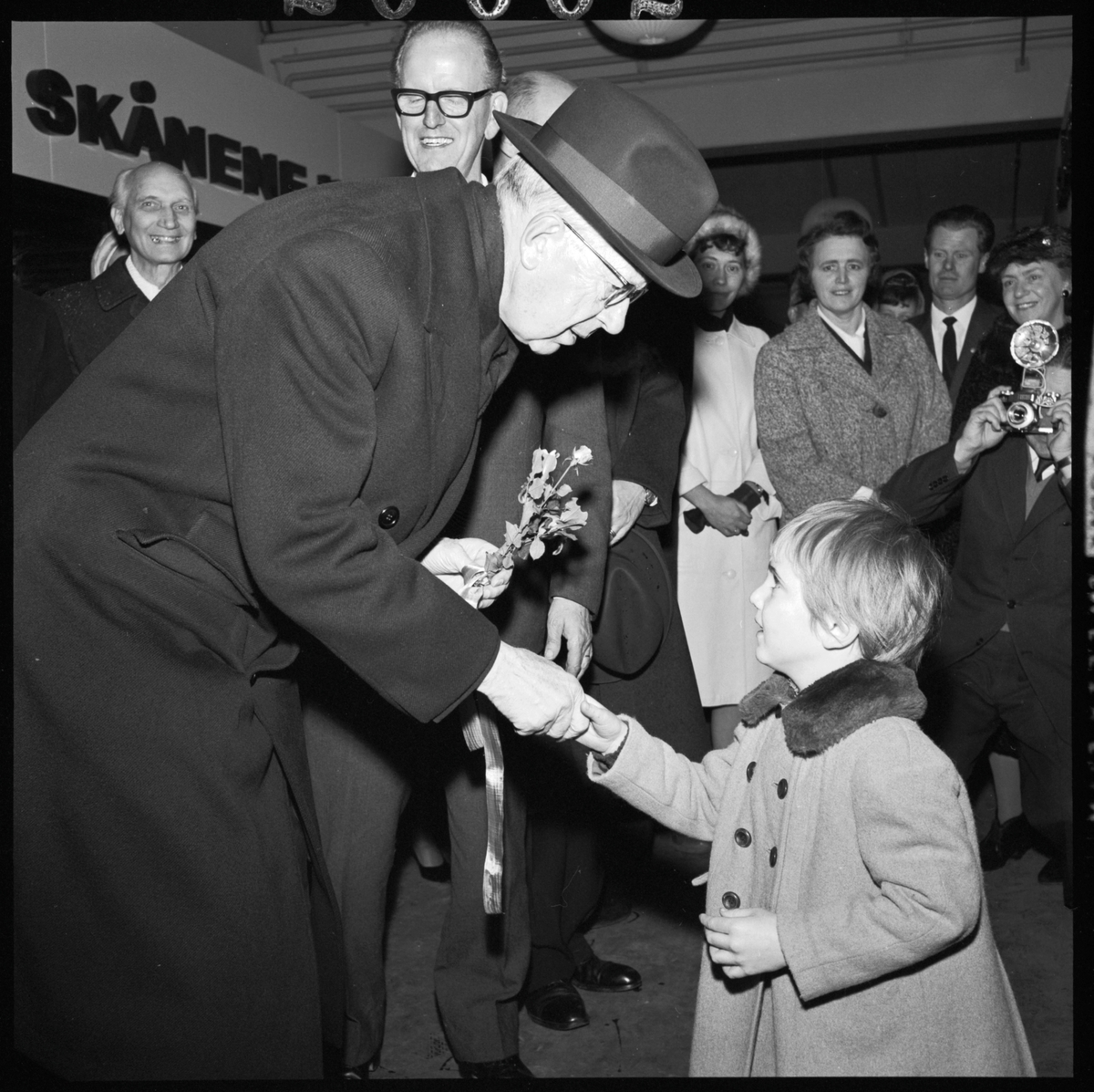Invigning av Årsta partihandel. Kung Gustav VI Adolf får blommor av liten flicka