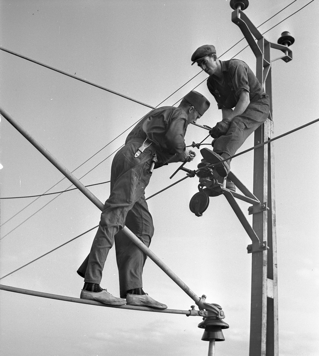Elektrifiering av linjen Ånge-Sundsvall. Fastsättning av lanlås på återgångsledning vid förankringspunkt.