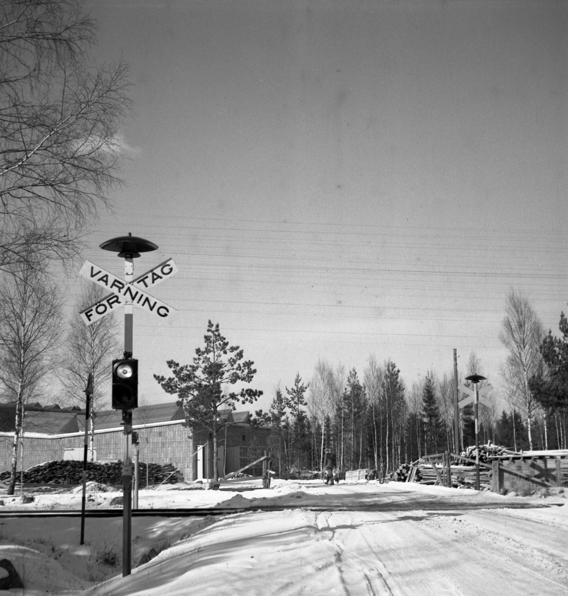 Automatisk vägsignalanläggning med el-ljussignaler. Kryssmärke : Varning för tåg. Bevakad övergång. Sträckan Uppsala - Enköping.
