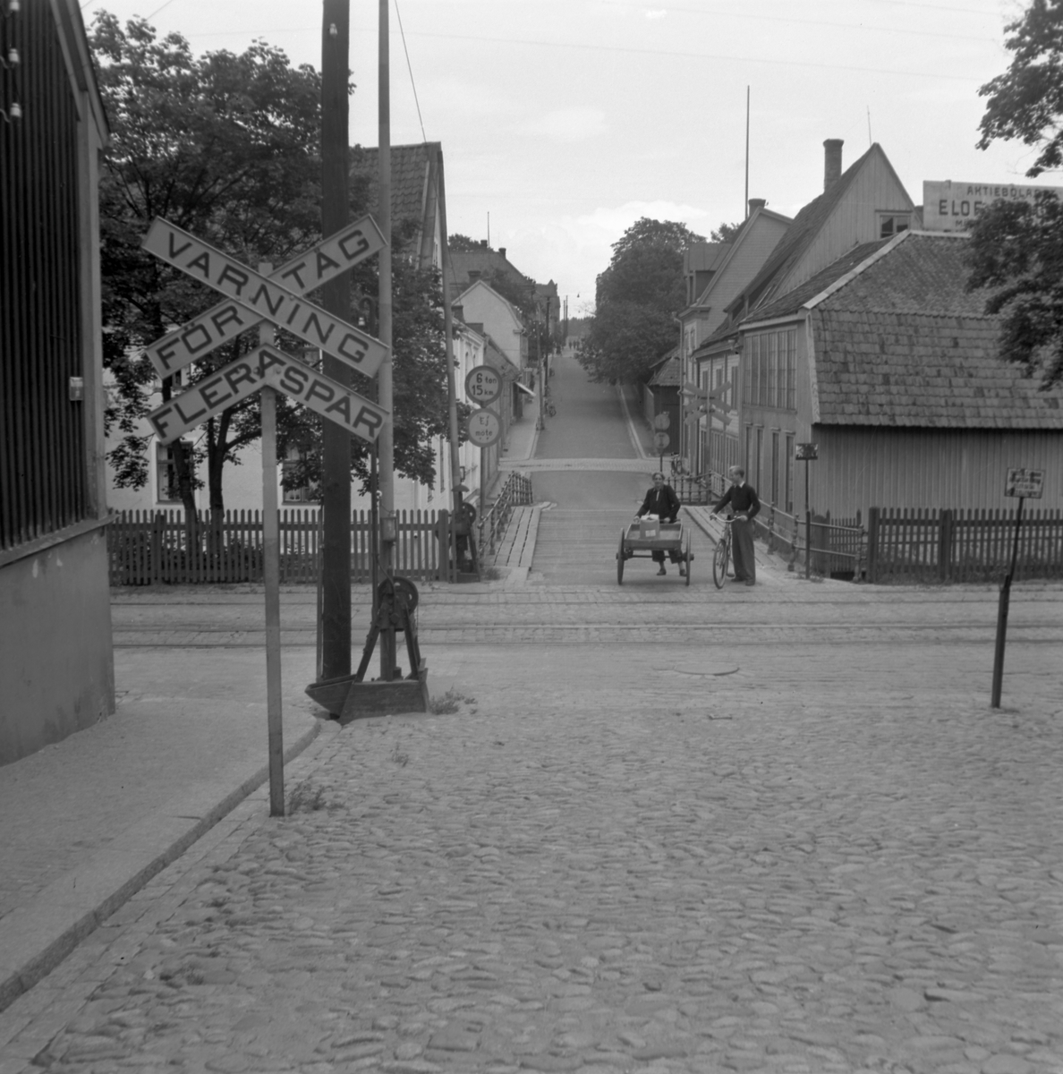 Titel: Vägövergång med kryssmärke: Varning för tåg och varningsvinkel: Flera spår .