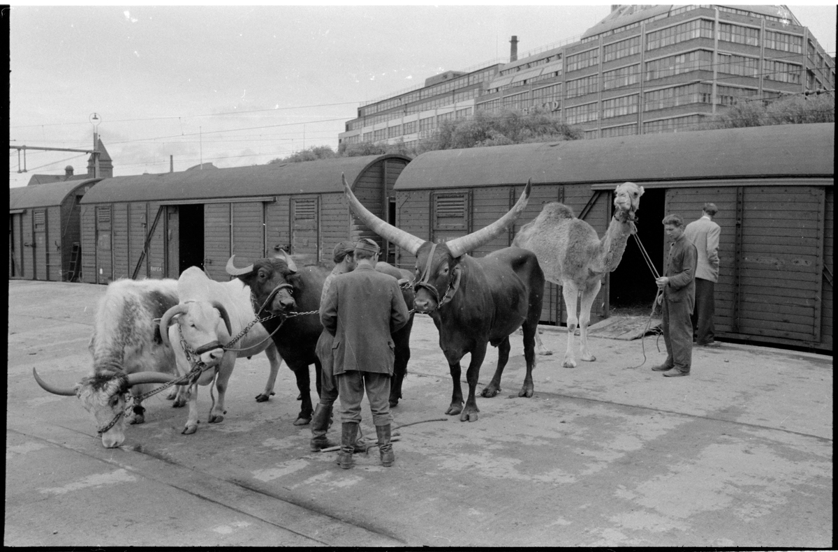 Avlastning av djur från godsvagn.