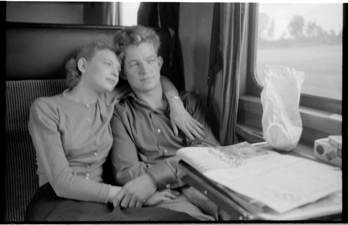 Titel: Statens Järnvägar, SJ personvagn med tågresenärer.
