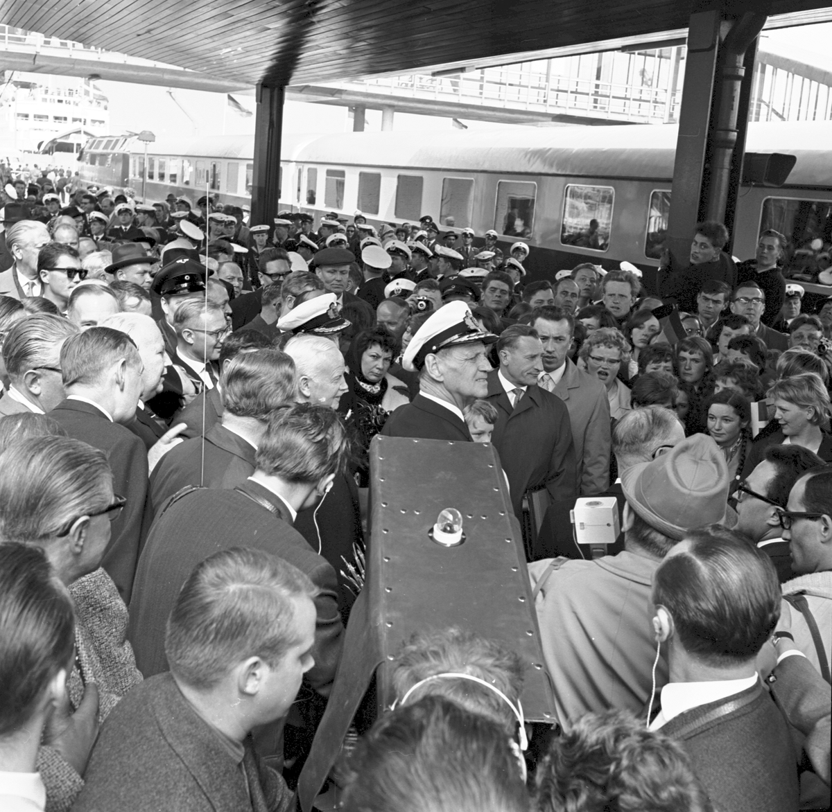 Invigning av "Fågelvägslinjen" mellan Rodbyhavn, Lolland, Danmark och Puttgarden, Fehmarn, Tyskland. Den nya färjelinjen kallas "Fågelvägslinjen", på danska Fugleflugtslinien och på tyska Vogelflugslinie, eftersom linjen följer flyttfåglarnas flygrutt. Danmarks kung Frederik IX, i mitten i profil