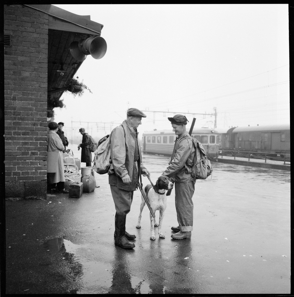 Två jägare med utrustning och jakthund på plattformen.