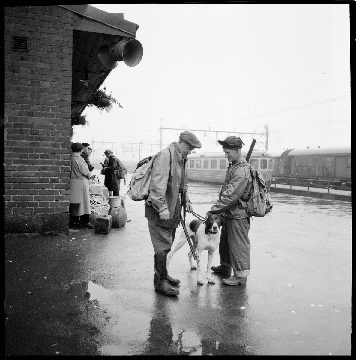 Två jägare med utrustning och jakthund på plattformen.