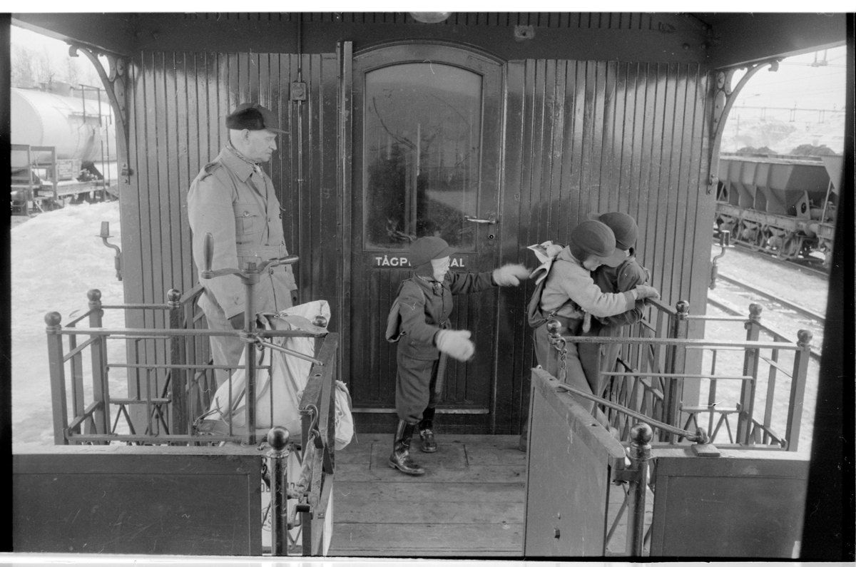 Lekande barn, som övervakas av en vuxen, på yttre plattformen på vagnen.
