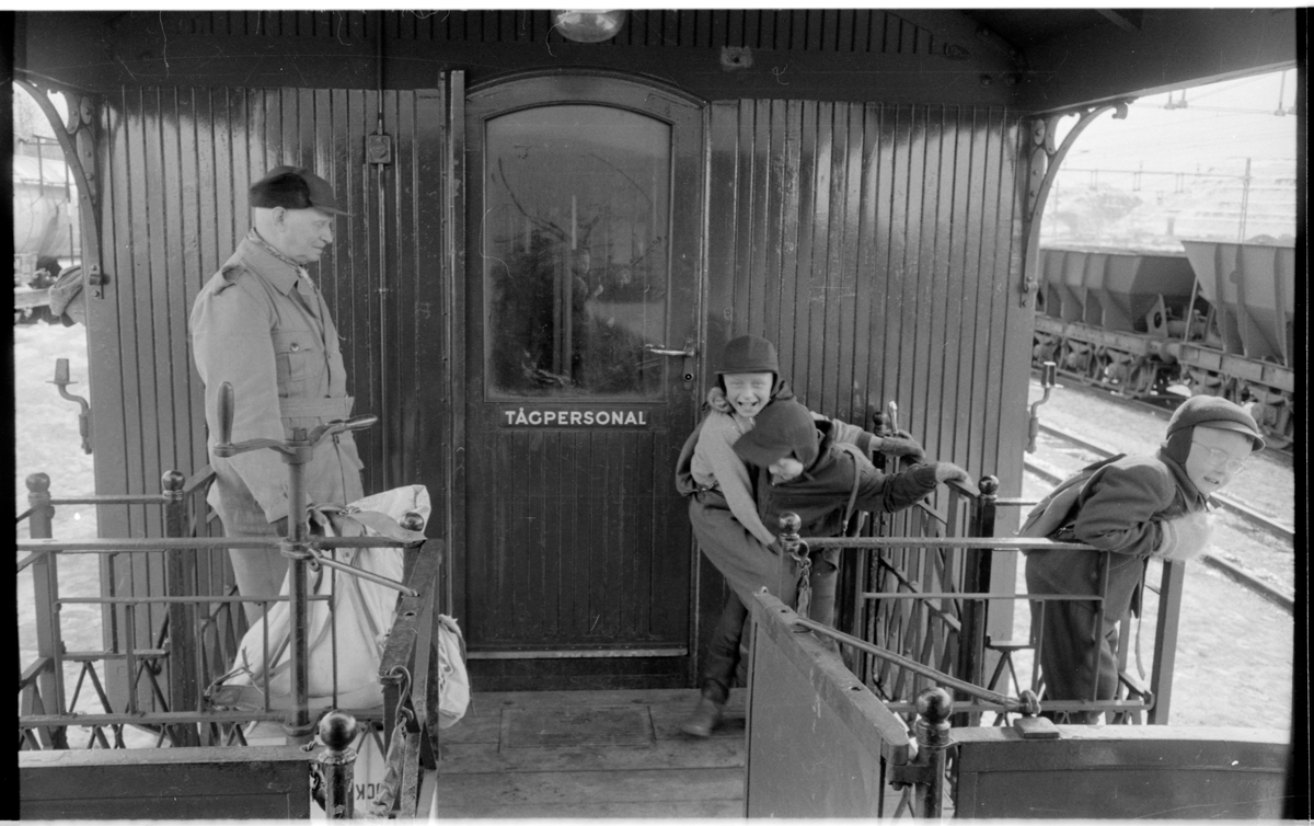Lekande barn, som övervakas av en vuxen, på yttre plattformen på vagnen.