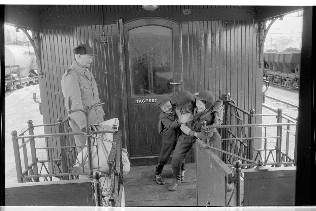 Lekande barn, som övervakas av en vuxen, på yttre plattformen på vagnen.