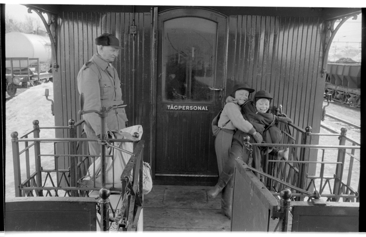 Lekande barn, som övervakas av en vuxen, på yttre plattformen på vagnen.