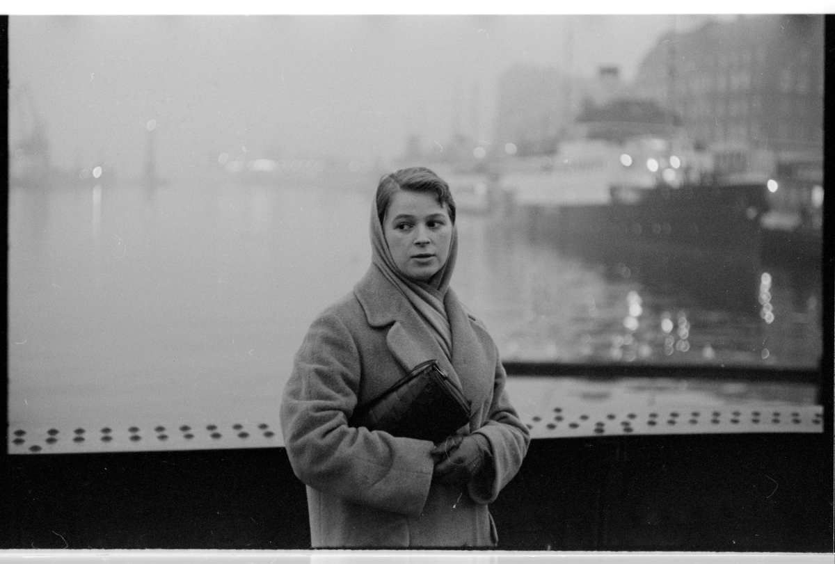 Kvinna på bro. Öresundsbåt i bakgrunden.