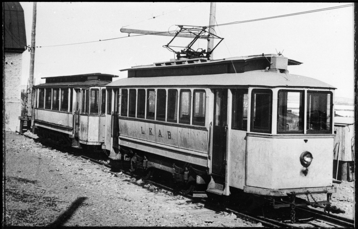 Luossavaara-Kiirunavaara Aktiebolag, LKAB spårvägståg. Spårvagnen är en före detta Aktiebolaget Stockholms Spårvägar, SS A8 212 och före detta Aktiebolaget Stockholms Spårvägar, SS A2c 121 som användes som släpvagn.