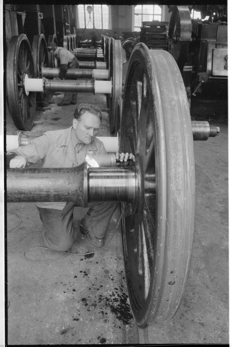 Verkstadsarbetare kontrollerar hjulaxeln på hjulparet.