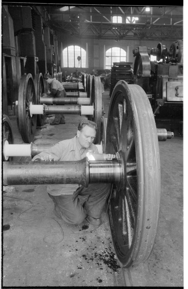 Verkstadsarbetare kontrollerar hjulaxeln på hjulparet.