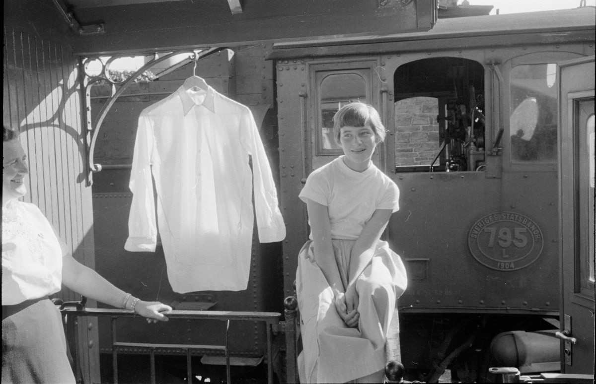 Skol- och tåghemsresenärer med Statens Järnvägar, SJ L 795 i bakgrunden.