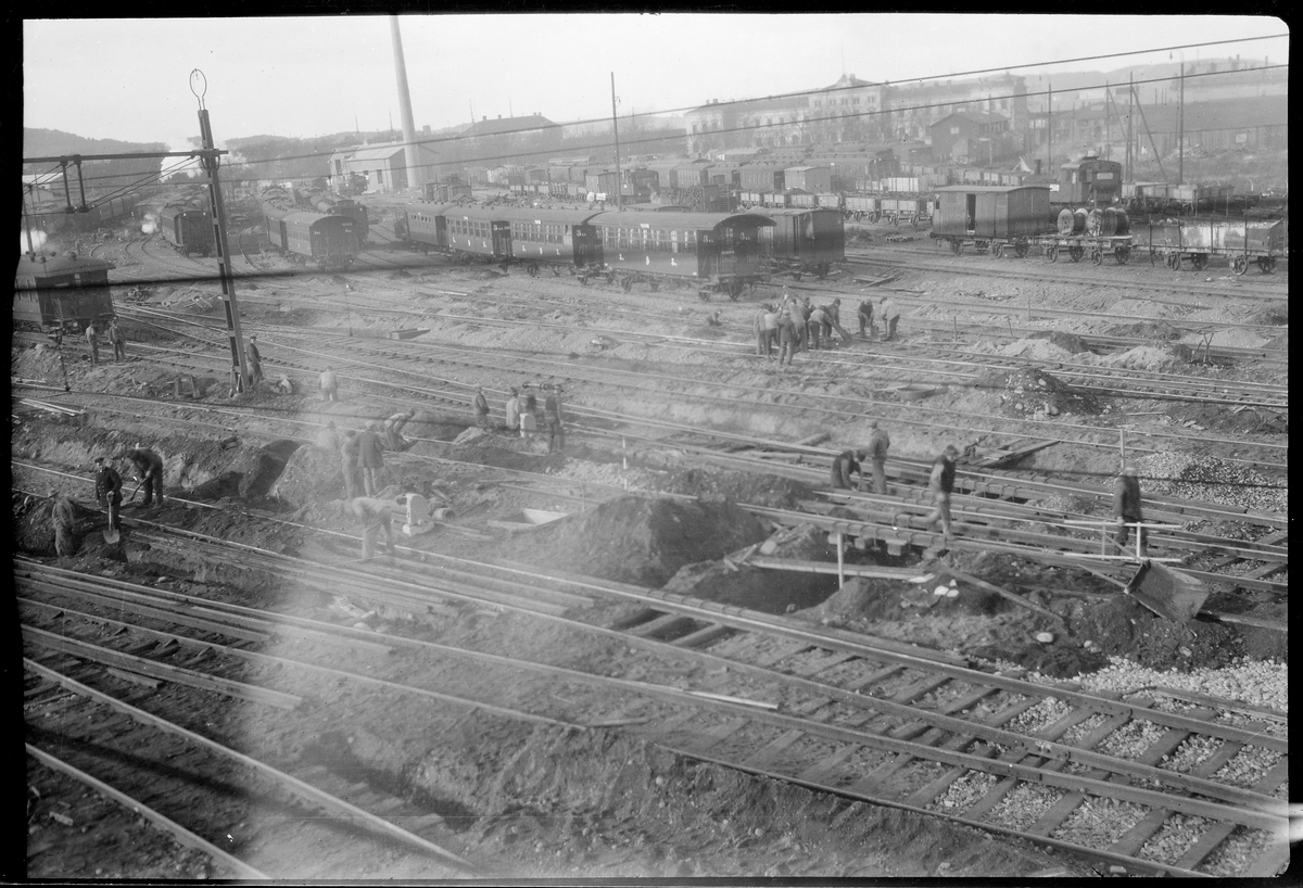 Titel: Göteborg C under ombyggnaden 1925-1931. I bakgrunden Bergslagernas Järnvägs stationshus Göteborg N.
