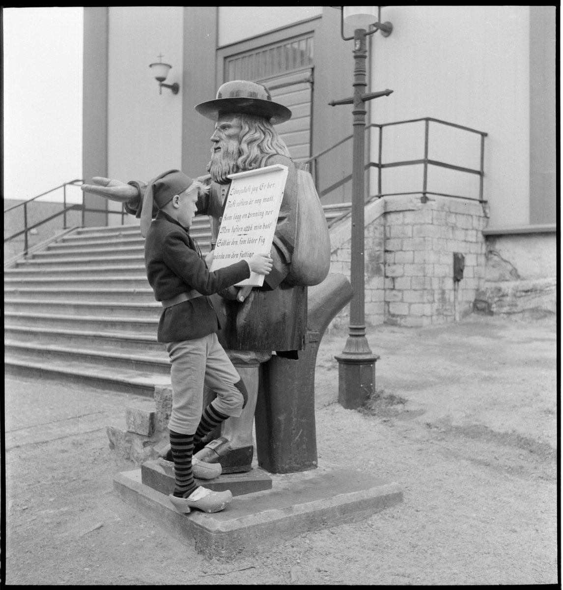 Alf Larssons som Nils Holgersson besöker "Rosenbom" utanför Amiralitetskyrkan i Karlskrona.