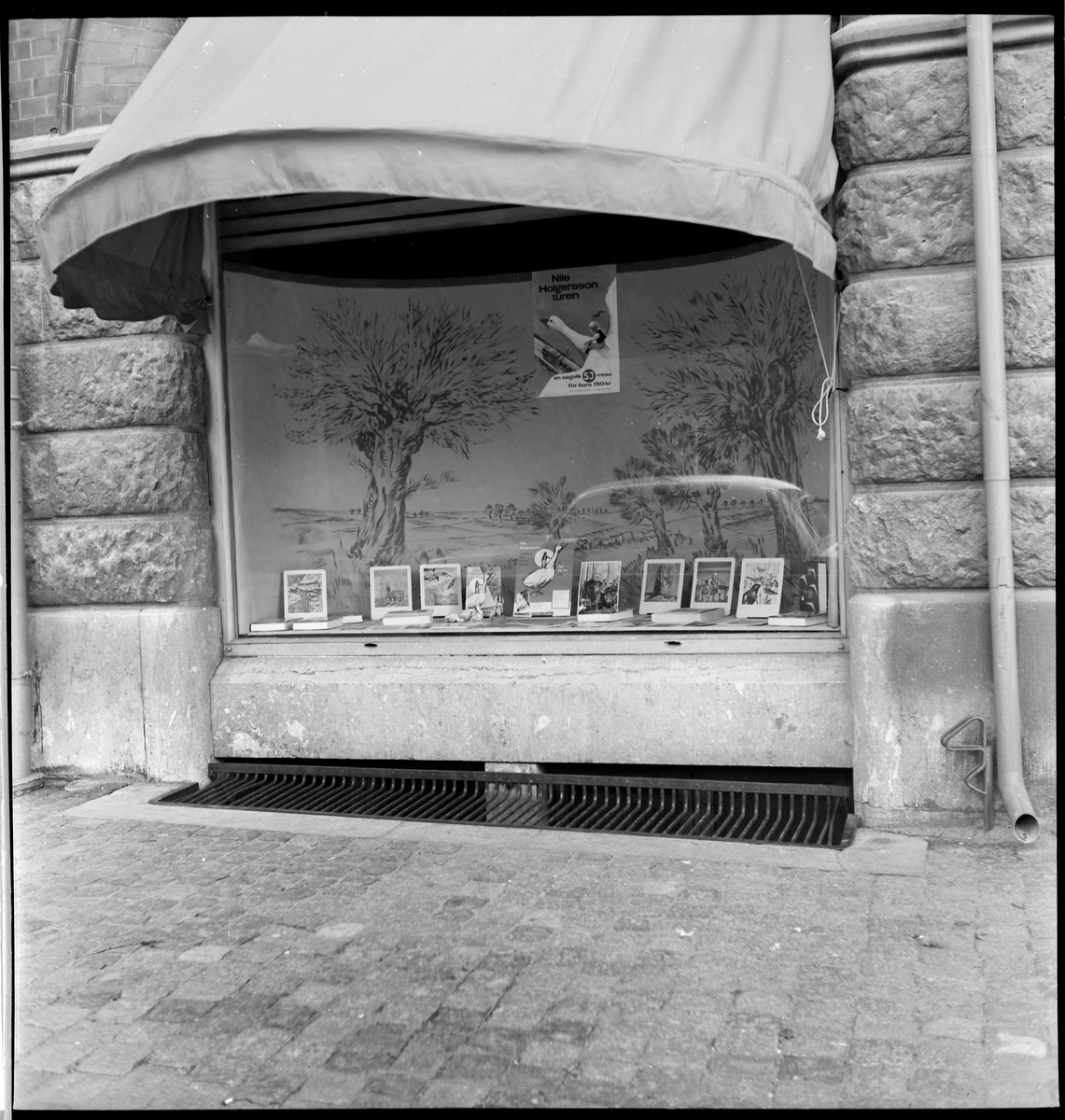 Bokhandel i Ystad med affisch för Nils Holgersson turen med Statens Järnvägar, SJ.