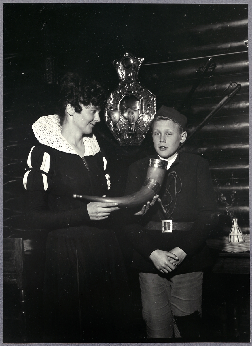 Titel: Alf Larsson som Nils Holgersson blir erbjuden dryck ur ett dryckeshorn.